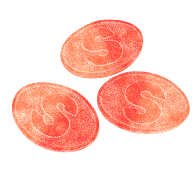 Ingredienser: Glukossirap, socker, majsstärkelse, syror: citronsyra, äppelsyra, surhetsreglerande medel: natriummalater, natriumcitrater, naturlig arom, färgämne: paprikaextrakt. VETEstärkelse.